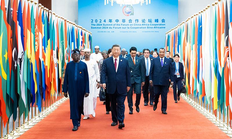 △2024年9月5日,习近平主席在北京人民大会堂出席中非合作论坛北京峰会开幕式并发表主旨讲话。这是习主席同外方领导人共同步入会场。