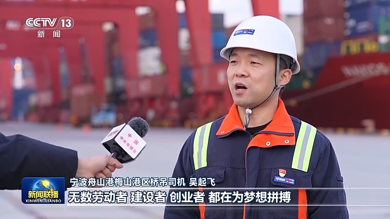 宁波舟山港梅山港区桥吊司机 吴起飞:习近平总书记在2025年新年贺词里说,无数劳动者、建设者、创业者都在为梦想拼搏。2024年,我们实现了宁波舟山港梅山港区年集装箱吞吐量超一千万的目标。2025年,和团队的小伙伴们一起,把智慧港口建设好,为海港的发展贡献力量。