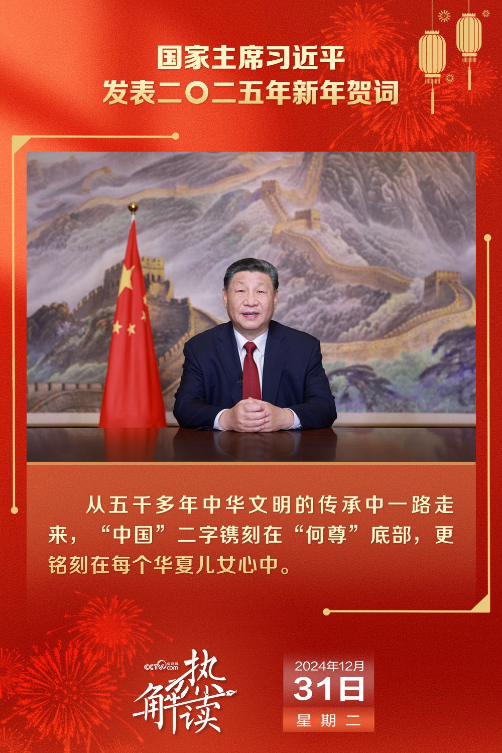 2024年12月31日晚,国家主席习近平通过中央广播电视总台和互联网,发表二〇二五年新年贺词。