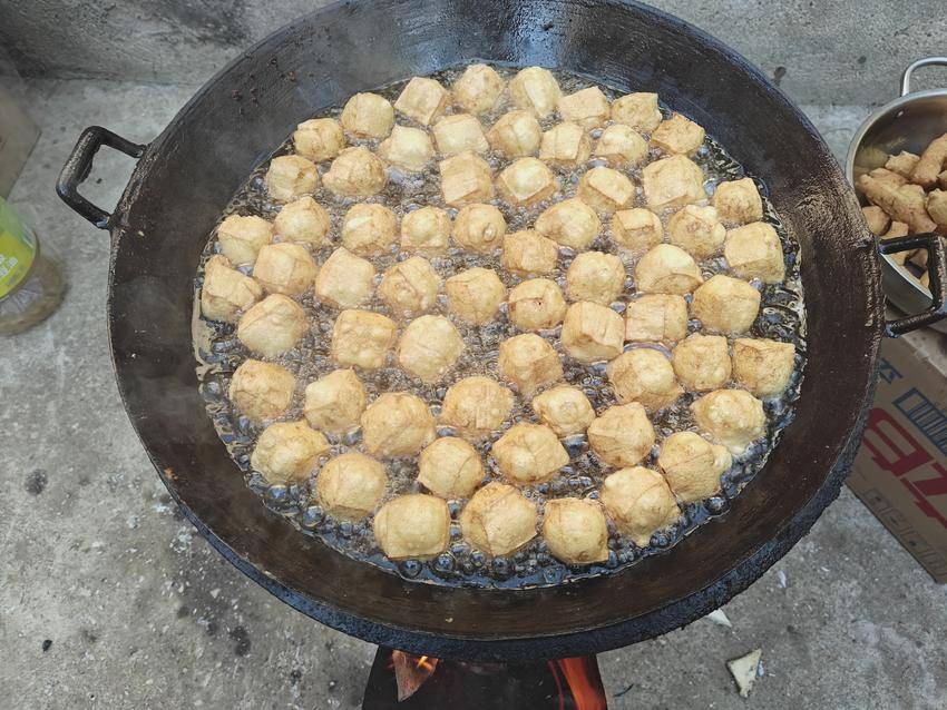 炸豆腐成为腊月里最具活力的画面。刚刚成型的豆腐,被巧手主妇们精心操刀,或切成规整的三角,或雕琢成方正的块状。自家榨取的菜籽油在锅中欢快地跳跃,当豆腐块轻轻滑入热油的怀抱,一场奇妙的蜕变便悄然开始。随着油温的传递,豆腐慢慢膨胀,像是被注入了幸福的魔力,逐渐变得圆鼓鼓、胖嘟嘟,色泽也从温润的洁白转为诱人的金黄,在油锅里欢快地翻滚着,散发出阵阵馥郁的香气,每一个都像是寓意着团圆美满的小金球,满含着对新年的憧憬与期待。