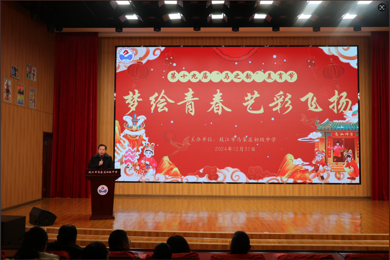 12月31日下午,枝江市马家店中学在学校阶梯教室举行了第十九届“马之韵”美育节文艺展演活动。学校全体老师,七、八、九年级学生代表现场参加了此次活动,其他班级在教室观看直播。学校党支部书记、校长刘志华作新年致辞。