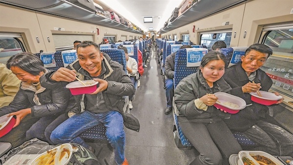 “在列车上,我们还为旅客准备了归途暖茶,午餐时间将有工作人员送餐至座位,确保旅客感受到家的温馨。”列车长蒋思宇说。