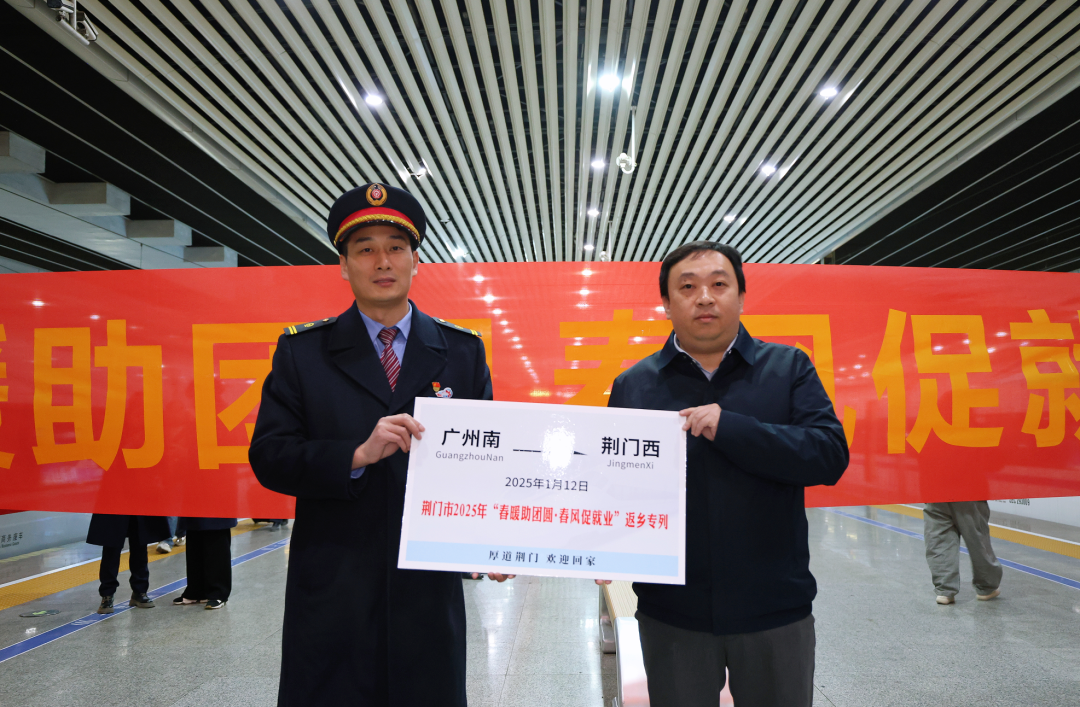 12日14时,搭乘专列的返乡人员来到荆门西站东广场,湖北省2025年“春风行动”启动仪式暨“接您回家”招聘会活动在这里举行。