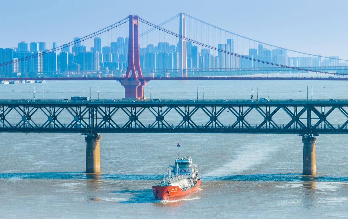 船舶行驶在长江武汉江段水域。(记者薛婷 摄)