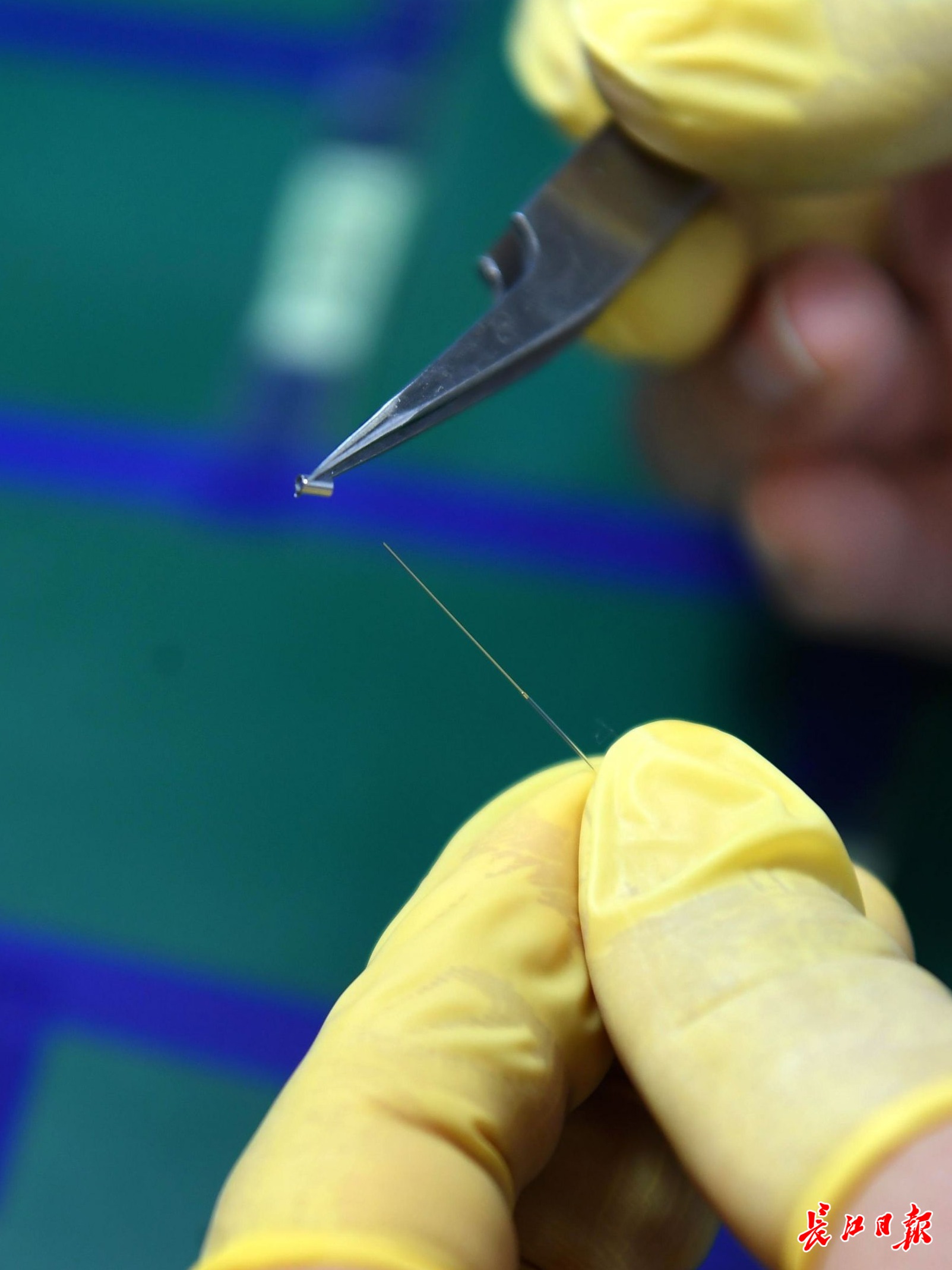 武汉楚星光纤应用技术有限公司生产车间,工作人员借助电子显微镜和电脑显示屏正在磨制和焊接头发丝般粗细的光纤,加工成高端透镜光纤,产品广泛应用在通信、传感等科技领域。 长江日报记者 高勇 摄