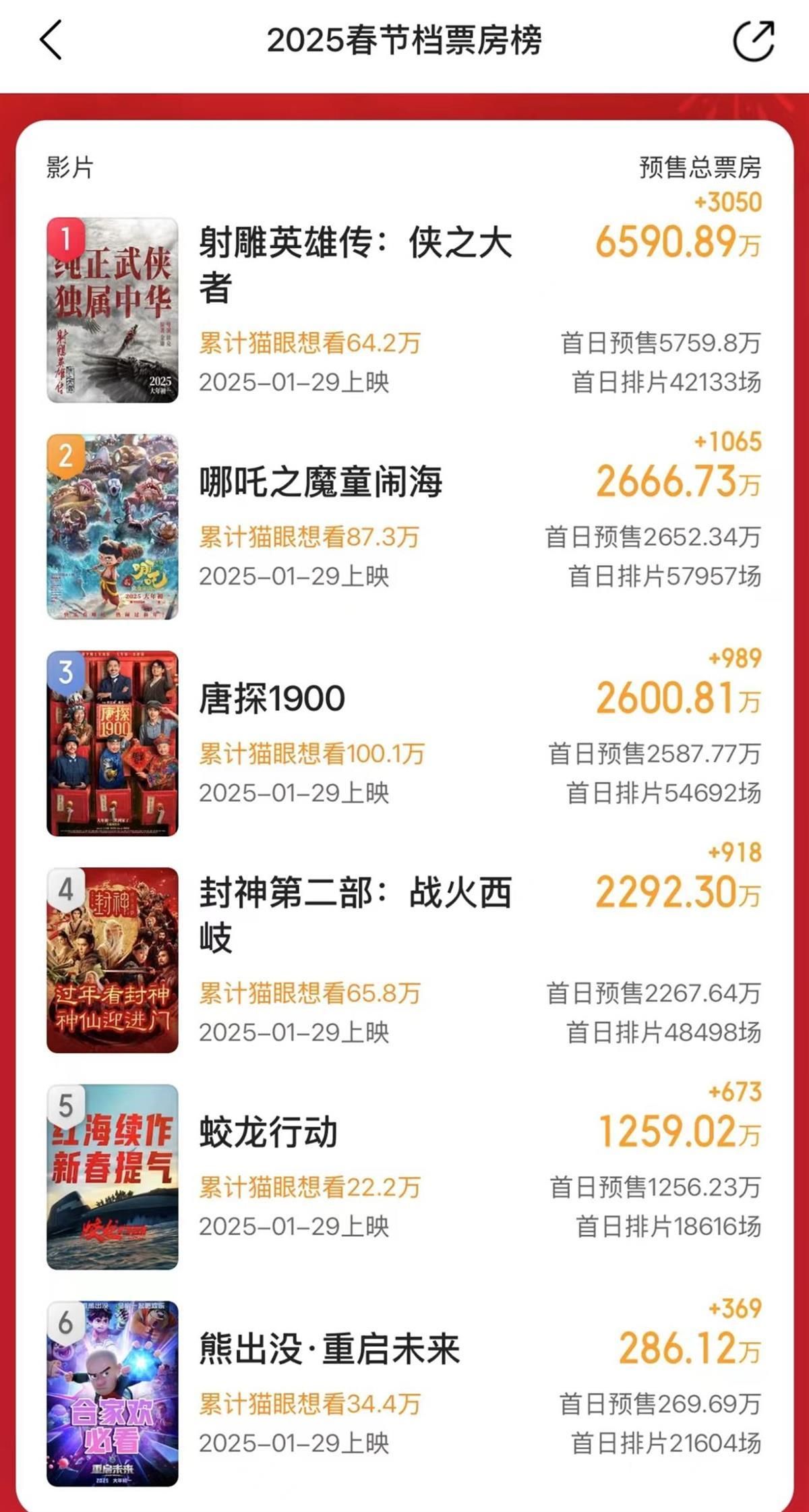 值得一提的是,《射雕英雄传:侠之大者》目前的排片量并不算高,在春节档6部影片中名列第4,该片能在排片量不占优的情况下,收获这么喜人的预售票房,肖战的影迷功不可没。根据历年春节档预售的经验来看,如无意外,《射雕英雄传:侠之大者》将成为2025春节档首部预售票房破亿的影片。