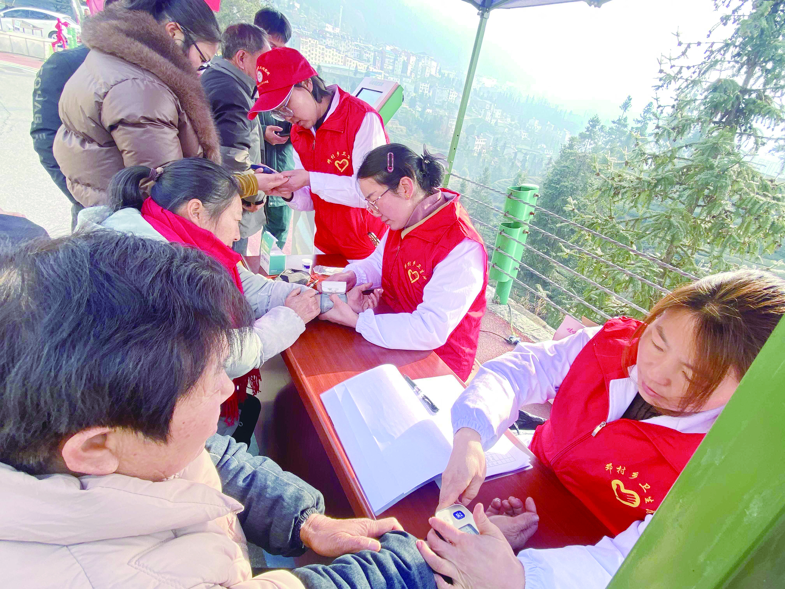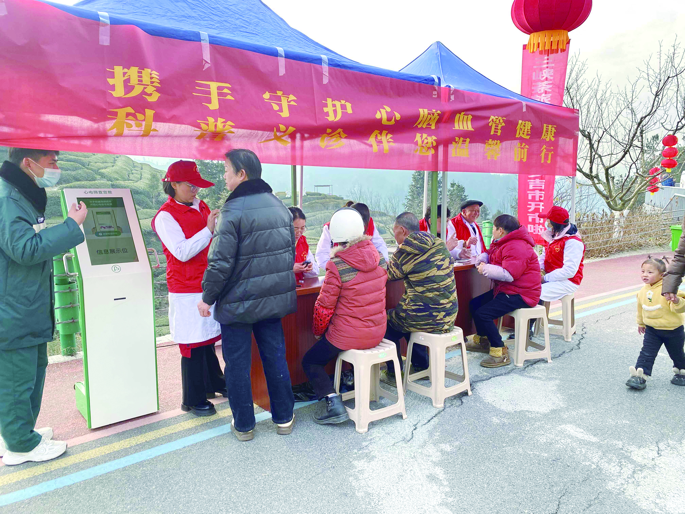 1月18日,夷陵区邓村乡卫生院在“茶乡吉市”活动现场组织开展以“携手守护心脑血管健康,科普义诊伴您温馨前行”为主题的义诊志愿者医疗服务活动,为广大居民朋友送去新春健康礼包。本次活动共为群众提供诊疗服务100余人次,测血压100余人次,测血糖40余人次,发放宣传册100余份。(通讯员魏玉容 摄)