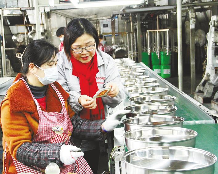 生产线上,一件件不锈钢厨具成品在传送带上移动,不一会儿就被打包、装箱。“春节前订单比较多,大家都在抓紧时间生产,保质保量完成订单。”朱传慧说。