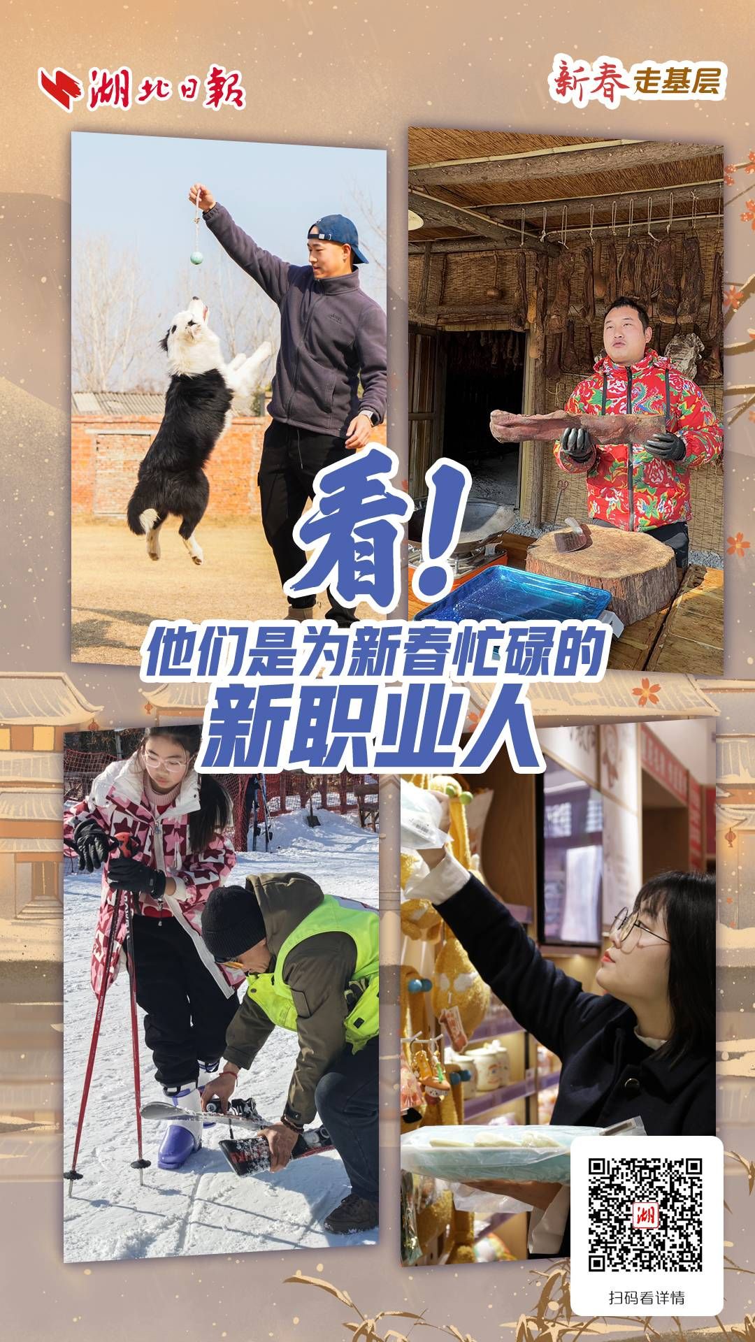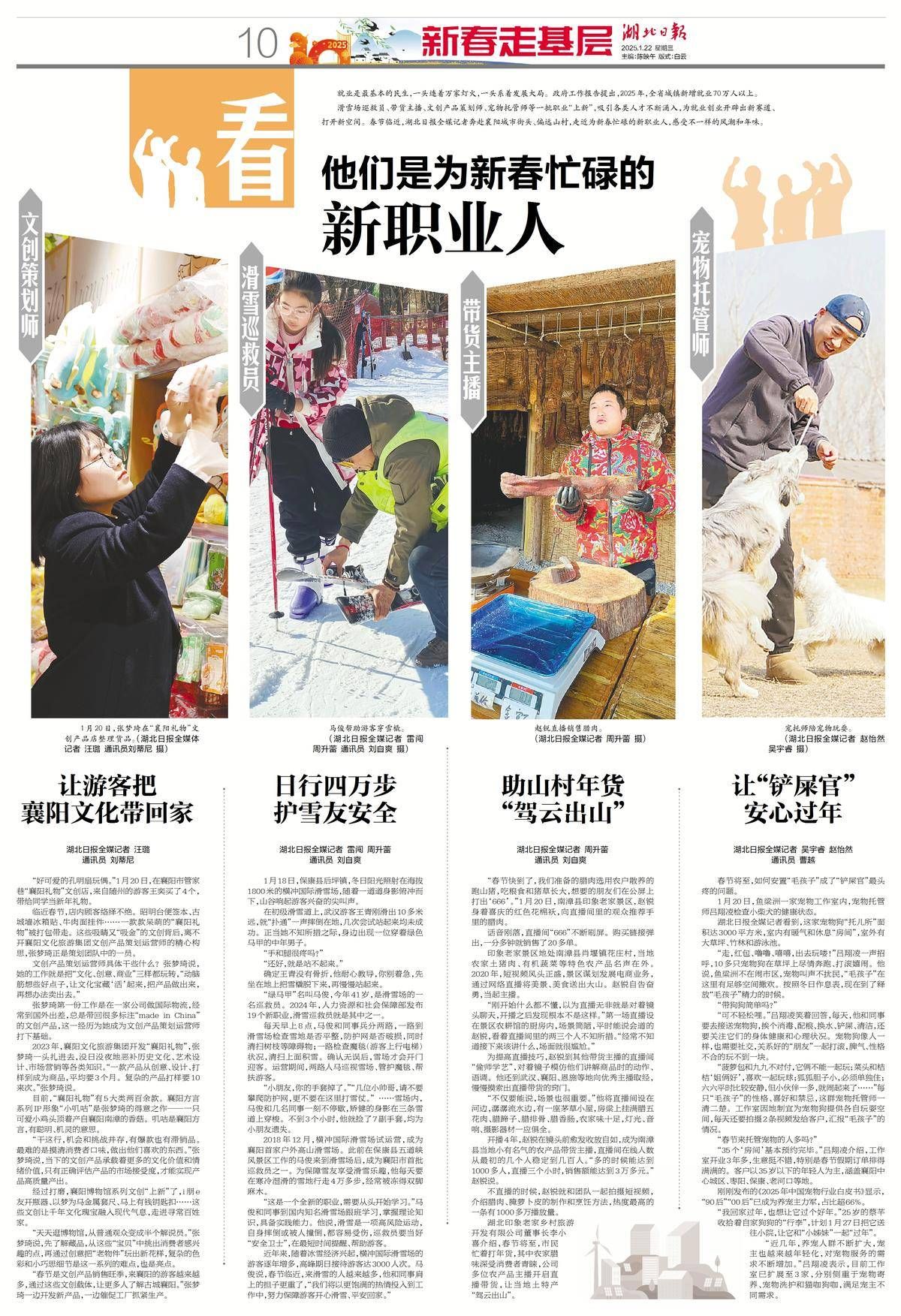 滑雪场巡救员、带货主播、文创产品策划师、宠物托管师等一批职业“上新”,吸引各类人才不断涌入,为就业创业开辟出新赛道、打开新空间。春节临近,湖北日报全媒记者奔赴襄阳城市街头、偏远山村,走近为新春忙碌的新职业人,感受不一样的风潮和年味。