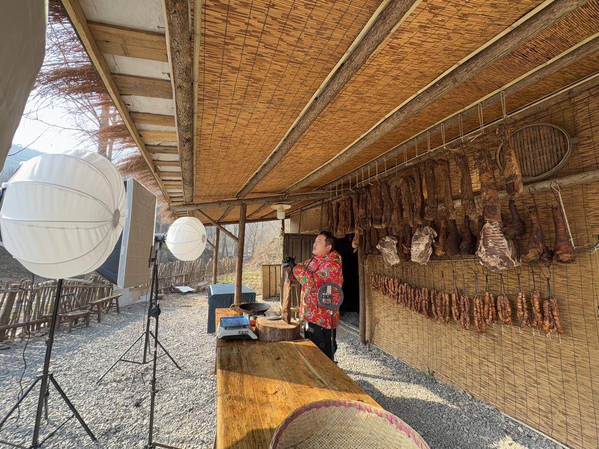 “不仅要能说,场景也很重要。”他将直播间设在河边,潺潺流水边,有一座茅草小屋,房梁上挂满腊五花肉、腊蹄子、腊排骨、腊香肠,农家味十足,灯光、音响、摄影器材一应俱全。