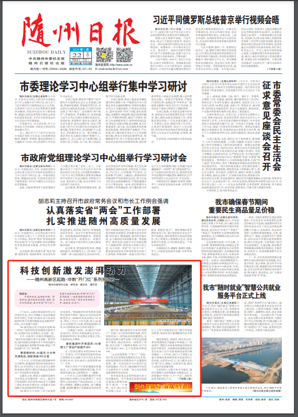 今年,市政府工作报告明确提出:“强化科技创新引领产业创新。”新年伊始,随州高新区相继有多个科技创新与产业创新融合案例取得突破,掀起了科技创新“开门红”的序幕。