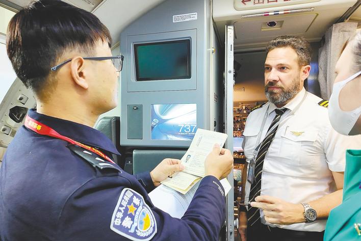 执勤民警在宜昌三峡国际机场检查机组人员。 (通讯员钟鹏宇 摄)
