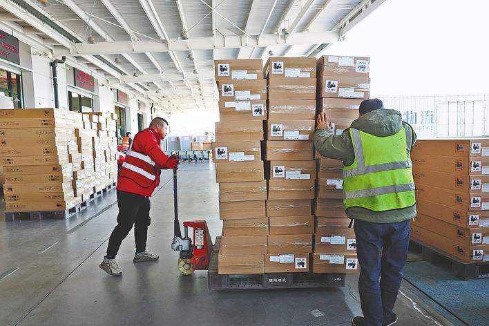 1月29日,农历正月初一,鄂州花湖国际机场北部货站一片忙碌。出港区月台上,4家货运代理公司一字排开,工人们将货物从货车上搬下来,送上传送带过安检。