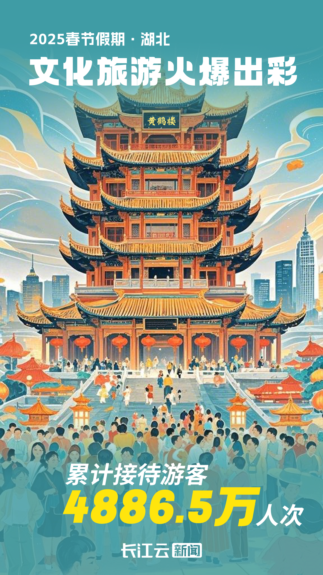 武汉春节文旅冲上热搜第1,搜索量暴增1160%。全省文旅市场热度高涨。春节假期,全省累计接待游客4886.5万人次,旅游总收入303.9亿元,同比增长15.5%。