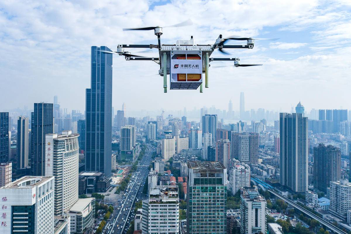 一台方舟40顺丰丰翼无人机携带着顾客下单的商品从华中第一商圈武商MALL起飞,相继越过长江、汉江后,在全球最大纯商业体武商梦时代楼顶降落,标志着全国首条跨江商贸低空无人机航线正式首飞。 (湖北日报全媒记者 任勇 摄)