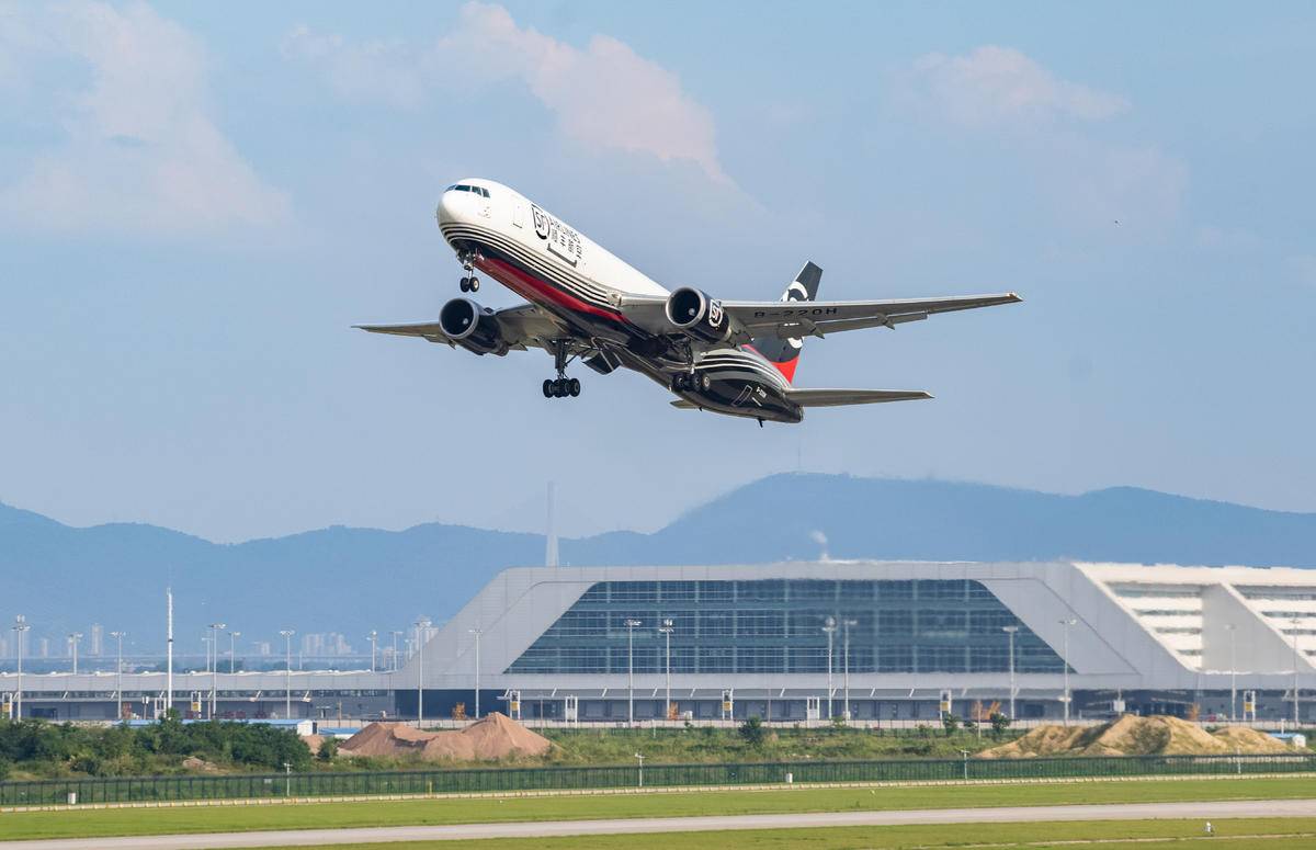 货机从鄂州花湖国际机场起飞,前往印度新德里。(湖北日报全媒记者 薛婷 摄)