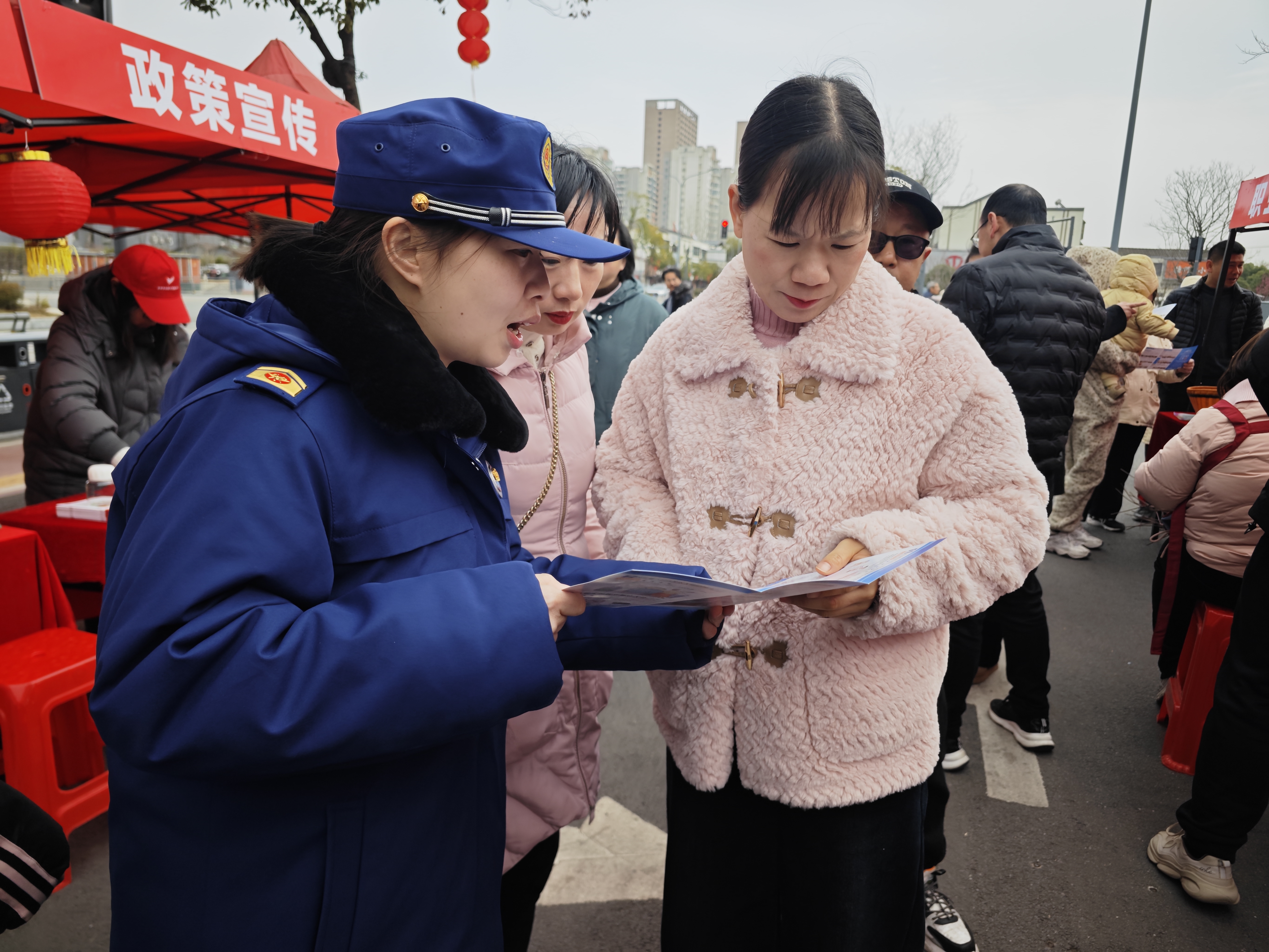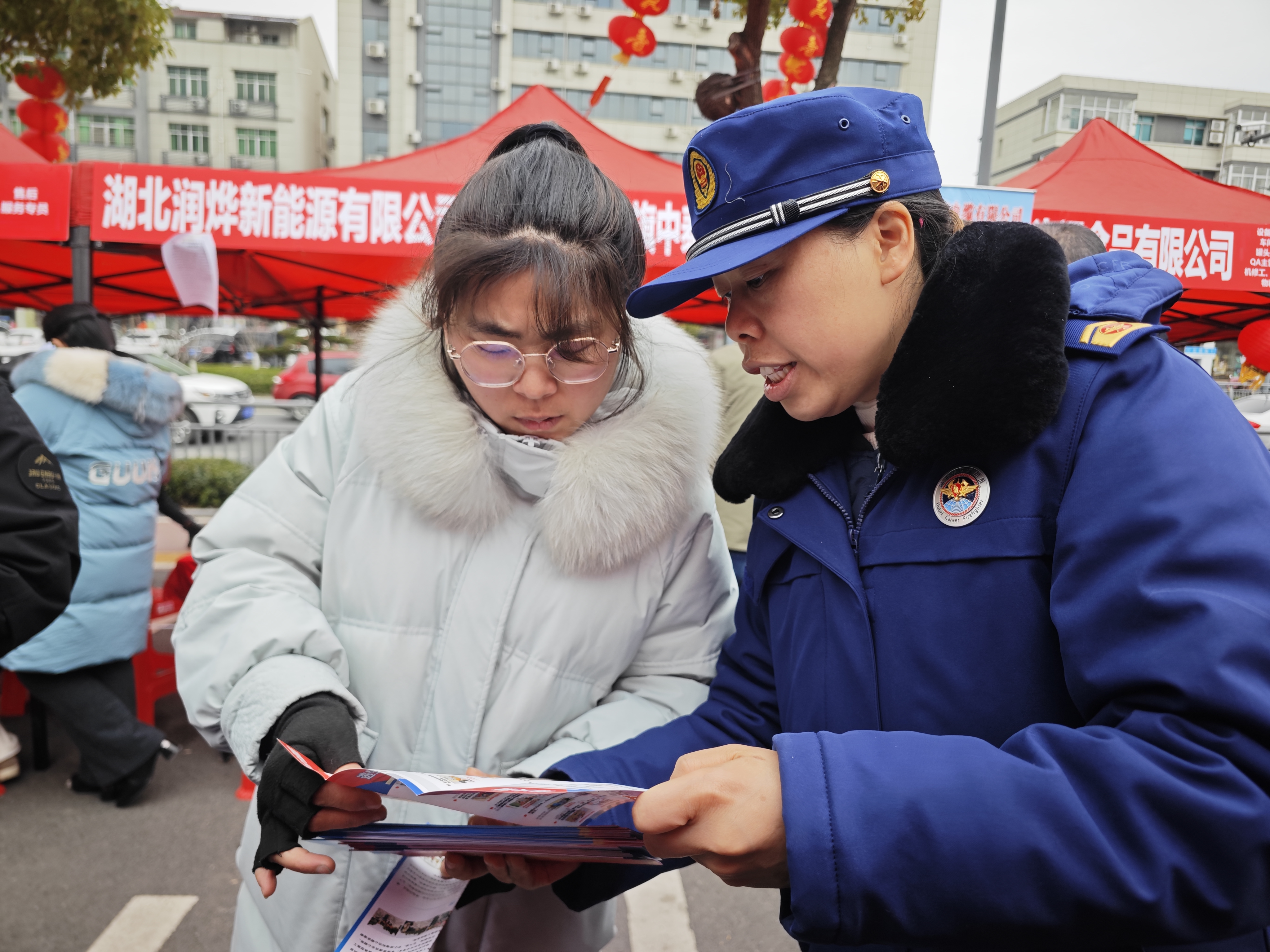 2月7日,猇亭区“安薪在猇”招聘会在金猇广场举行,猇亭区消防救援大队宣传小分队走进会场,开展消防知识宣传活动。