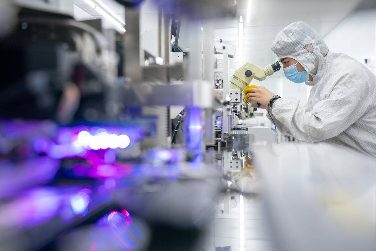 2024年12月18日,光迅科技高端光电子器件产业基地洁净厂房,员工在生产、测试AI数据中心用高速光模块。 (湖北日报全媒记者 魏铼 摄)