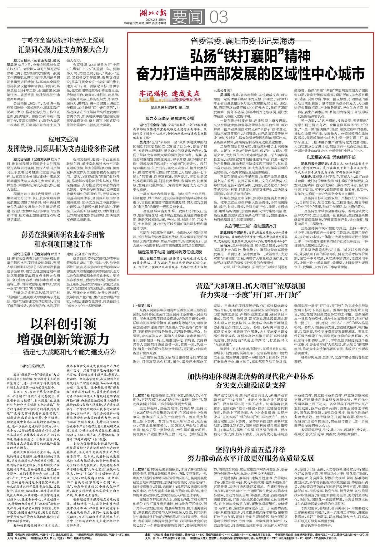 吴海涛:全省“新春第一会”就加快建成中部地区崛起的重要战略支点发出了动员令,彰显了省委、省政府牢记嘱托、感恩奋进的坚定政治自觉,体现了经济大省勇挑大梁的强烈使命担当。省委、省政府对襄阳发展高度关注、寄予厚望,赋予襄阳“打造中西部发展的区域性中心城市”的新定位。我们将知重而担、知责而行,强化支点意识,抬升发展标杆,按照忠林书记提出的“实施七大战略、提升七个能力”的要求,以更高标准、更严要求、更实举措谋划推进襄阳发展,促进发展能级、发展速度、发展质效、发展后劲整体提升,为湖北加快建成支点作出更大贡献。