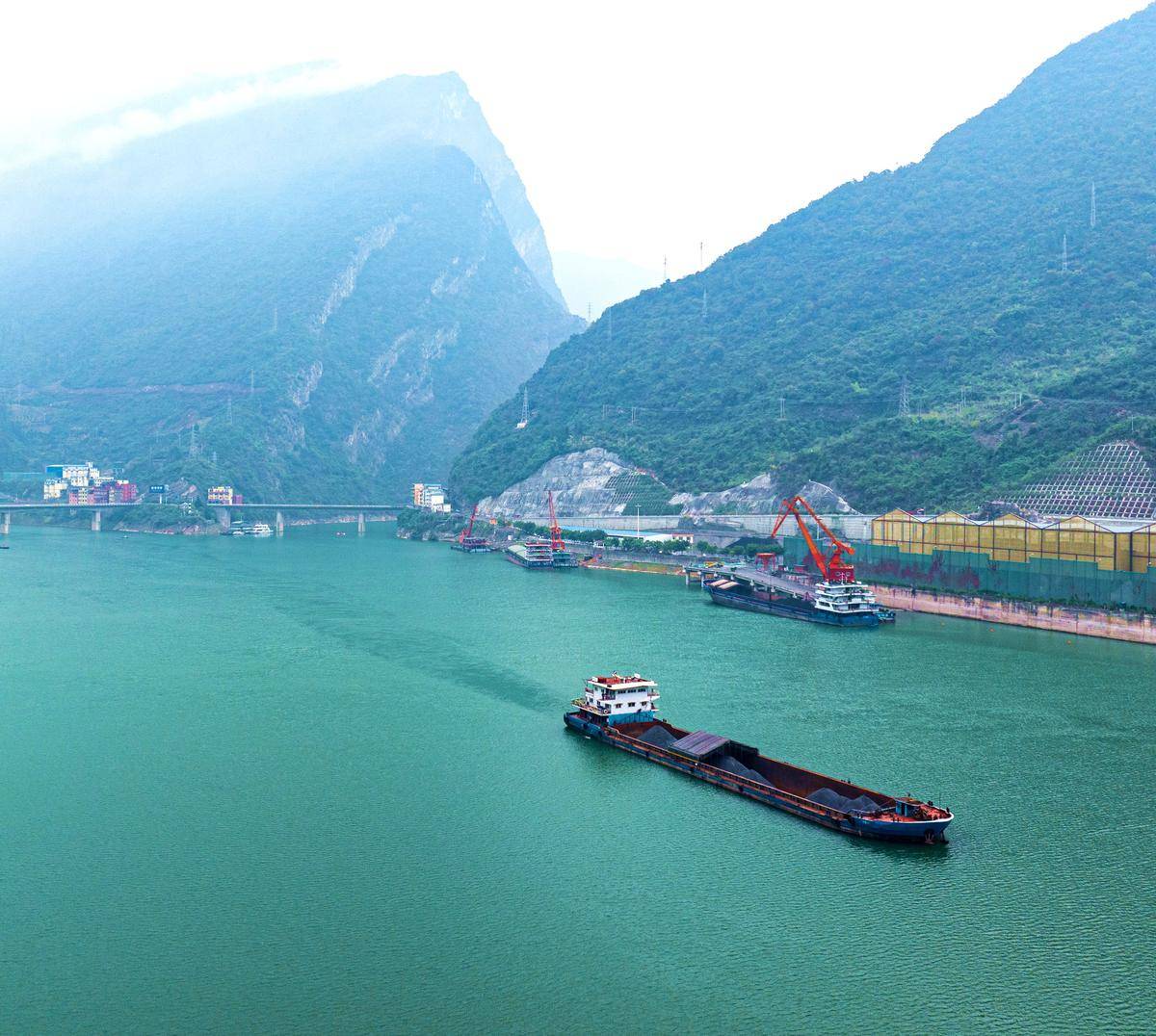 一排货运船舶停靠在兴山县峡口港货运码头,进行装卸货物。