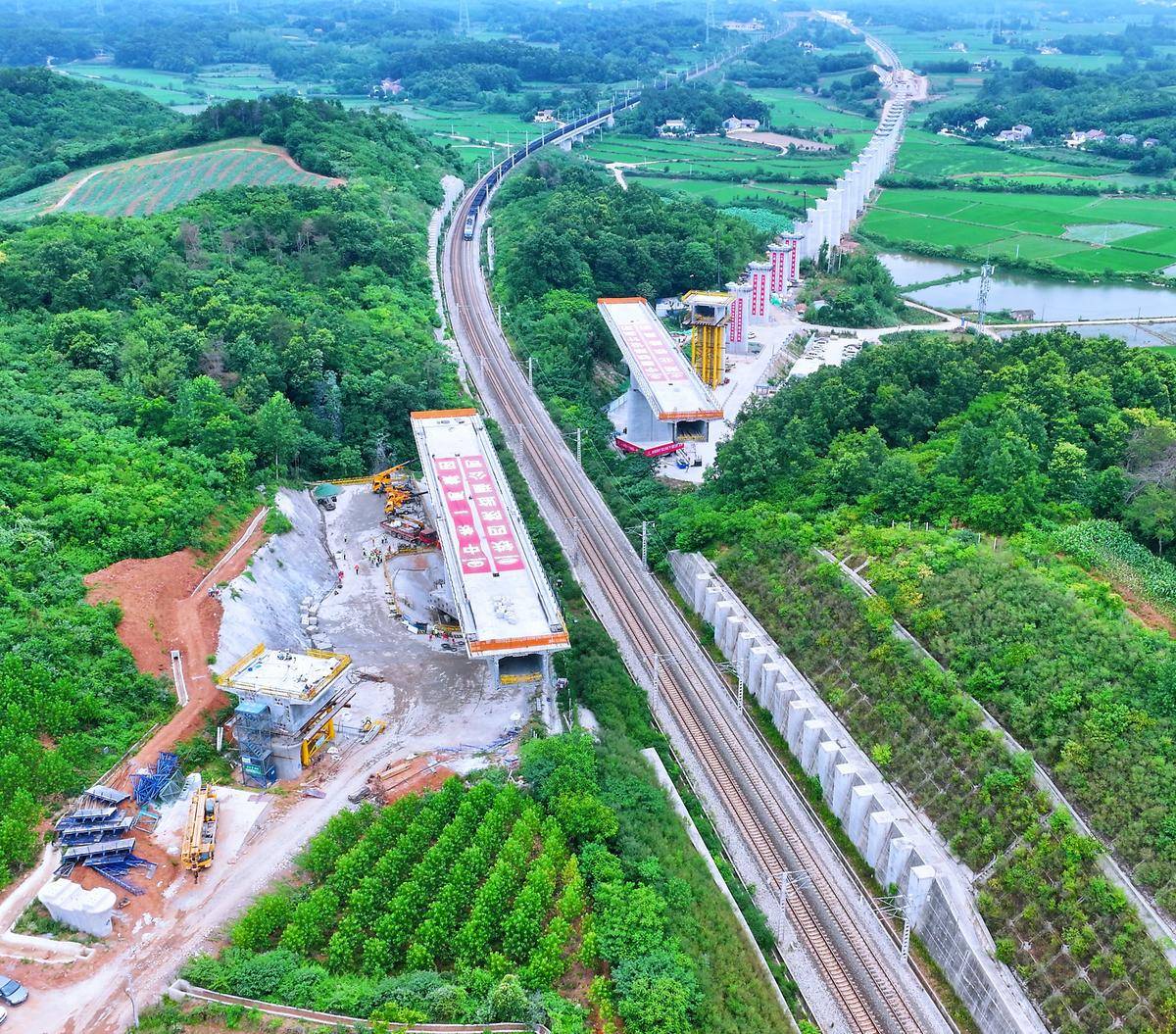 襄荆高铁跨浩吉铁路特大桥29号墩、30号墩连续梁同步顺时针旋转30度后,成功上跨浩吉铁路。