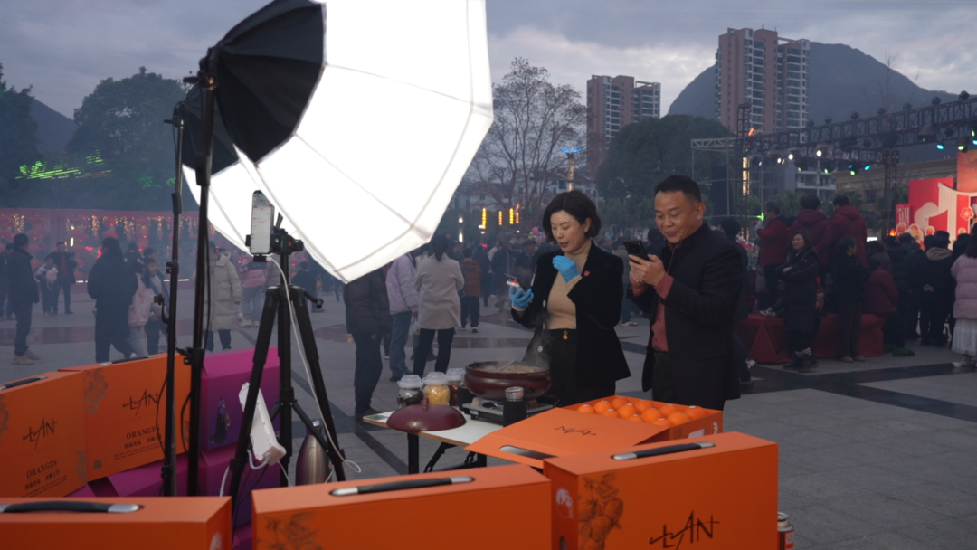 灯会现场,本地非遗美食受到市民的欢迎。在宜昌福兰居管理有限公司的展台,摆放着各种兴山本地的非遗美食。该公司董事长王福兰,更是将直播间搬到了现场。