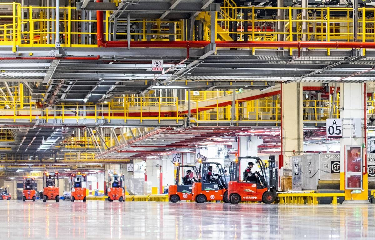 花湖国际机场转运中心,成排的叉车在作业。(湖北日报全媒记者 薛婷 通讯员 陆叶 摄)