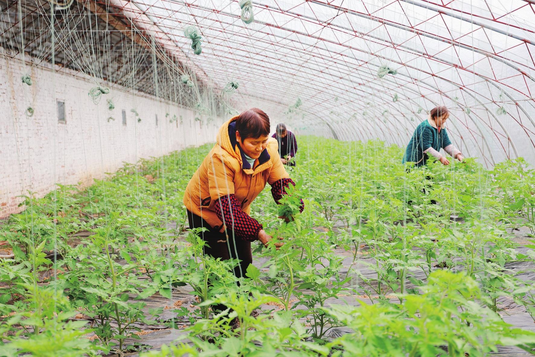 2月17日,夷陵区鸦鹊岭镇金和村,菜农正在大棚里管护西红柿苗。(记者黄翔、通讯员杨宜城 摄)
