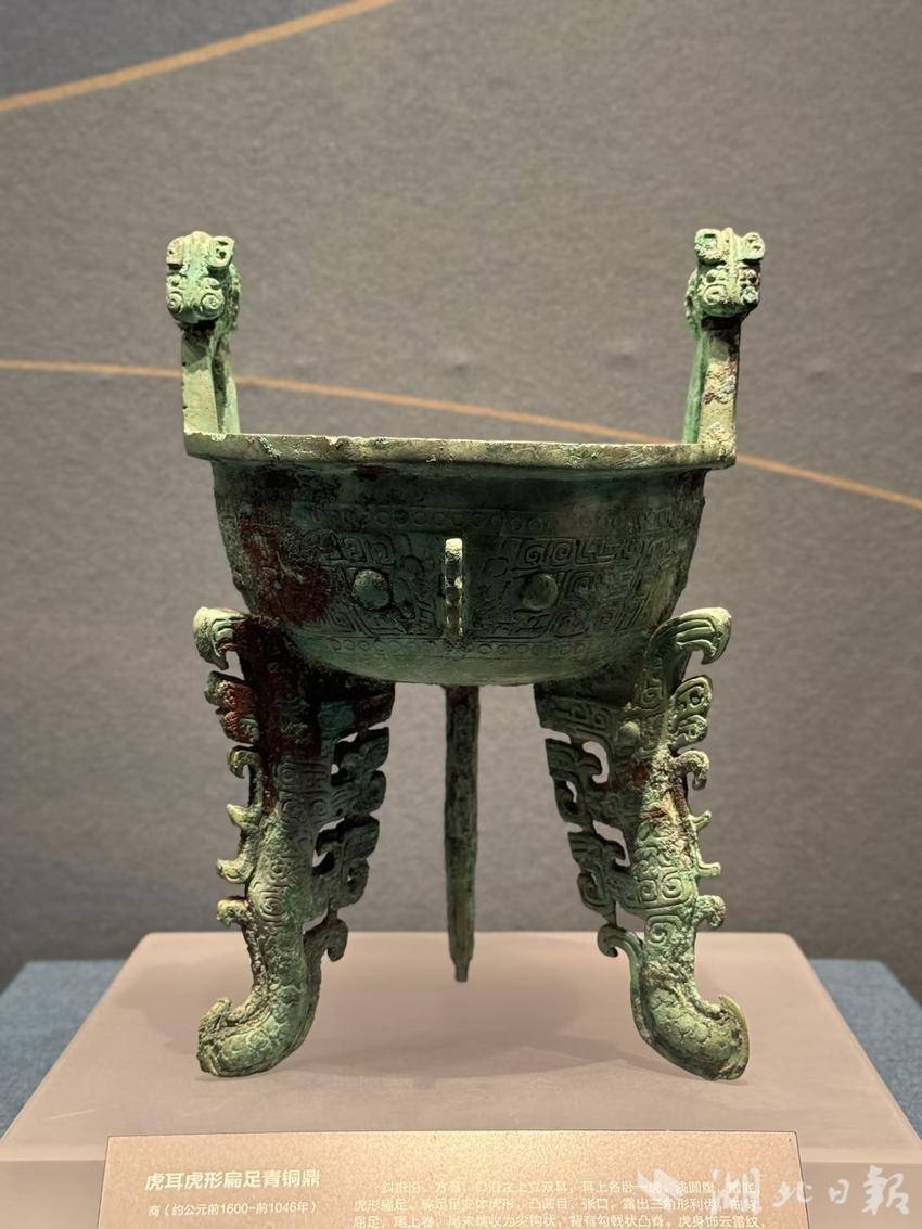 湖北多家博物馆都能看到类似文物的身影。如,盘龙城遗址博物院“商翼四极——商王朝地方文明特展”,就展出一件出土于新干大洋洲遗址的虎耳虎形扁足青铜鼎,为浅圆腹,圜底,虎形扁足。