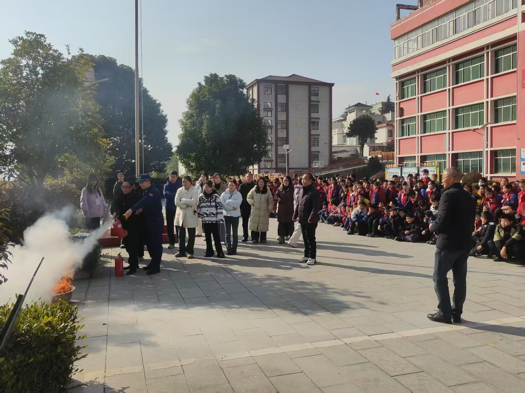 上午九点,伴随着急促的消防警报声,各班班主任迅速到位,全校师生按照既定的“防火应急疏散演练方案”迅速反应,用湿毛巾、湿手帕等捂住口鼻,弯着腰,按照拟定疏散路线有序引导师生撤离教学楼,到达操场指定位置集合。到达操场后,各班清点人数,整个疏散过程全体师生各司其职、紧密配合、安全高效,达到了预期效果。