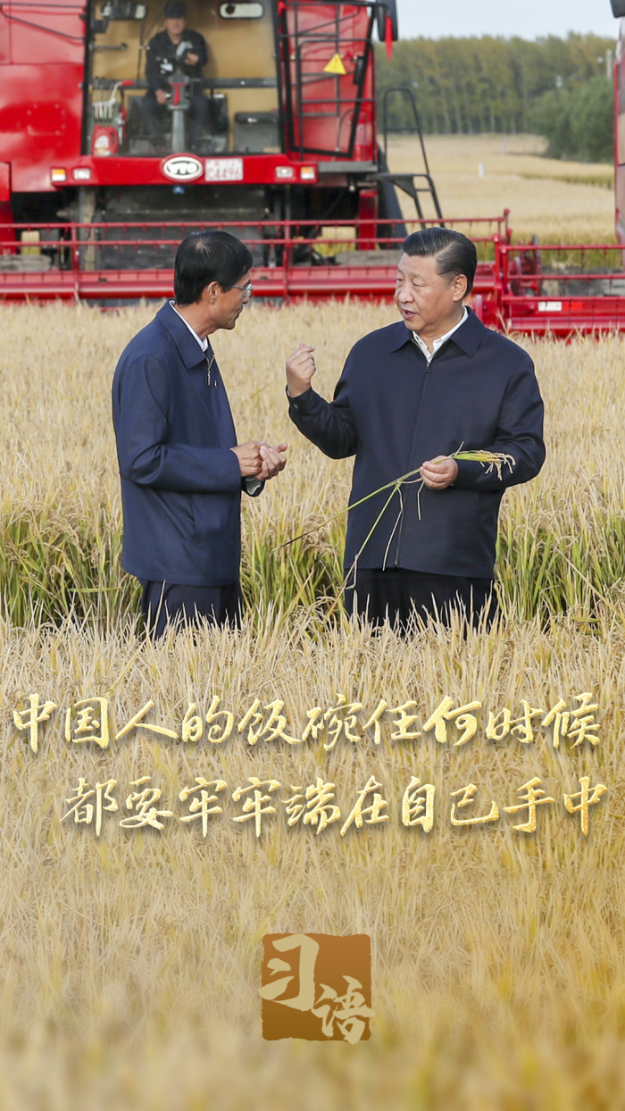 “坚决守住18亿亩耕地红线”、“树立大农业观、大食物观”、“要健全种粮农民收益保障机制”、“要落实藏粮于地、藏粮于技战略”、“集中力量破难题、补短板、强优势、控风险,实现种业科技自立自强、种源自主可控”……习近平总书记对端牢中国饭碗作出一系列部署,他强调:“我国有14亿多人口,粮食安全必须靠我们自己保证,中国人的饭碗应该主要装中国粮。”