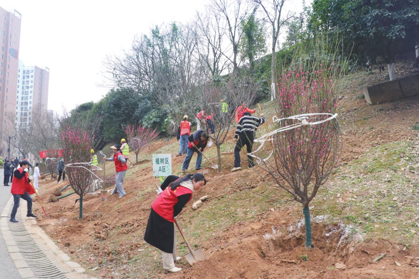 3月12日,宜昌高铁新城项目党支部联合夷陵区龙泉镇政府等单位,在站前广场开展义务植树活动。 (记者熊小磊、通讯员张睿 摄)