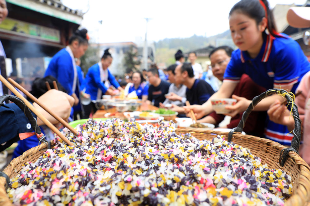 侗族群众围坐一起吃长桌宴。杨代富 摄