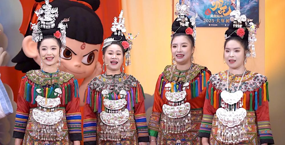 近日,贵州“舞乐蝉歌”乐团的成员们,在电影《哪吒之魔童闹海》的新春闹海直播现场表演侗族大歌。(受访者供图)