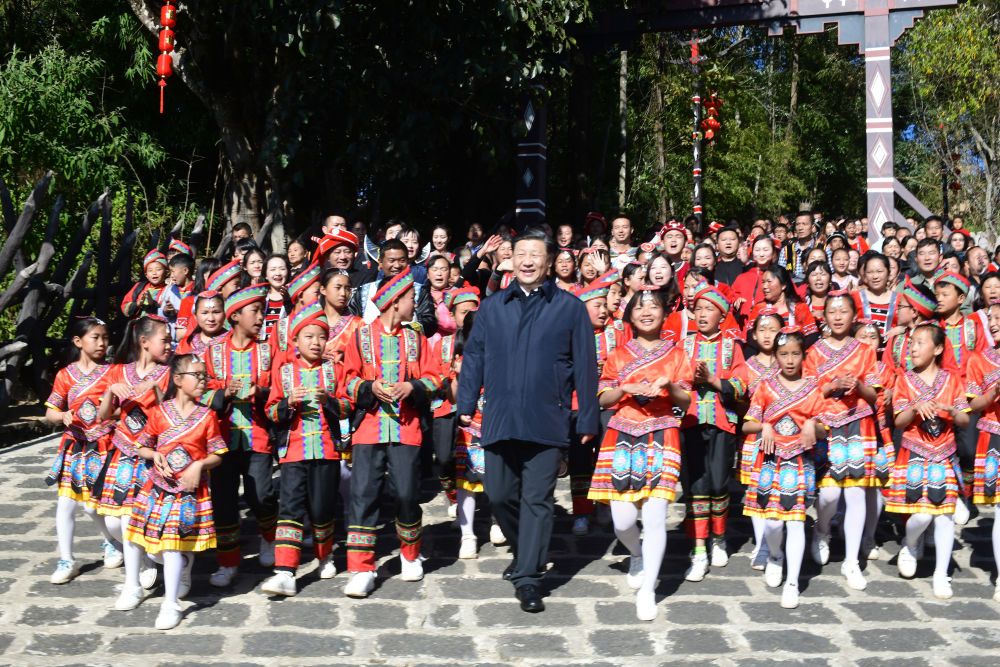 2020年1月19日下午,云南省腾冲市清水乡三家村中寨司莫拉佤族村的乡亲们唱着《阿佤人民唱新歌》,簇拥着习近平走出村口。