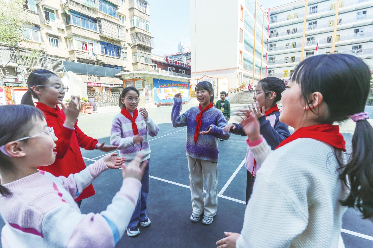 西陵区红星路小学,学生在操场上玩游戏。记者林潇 摄