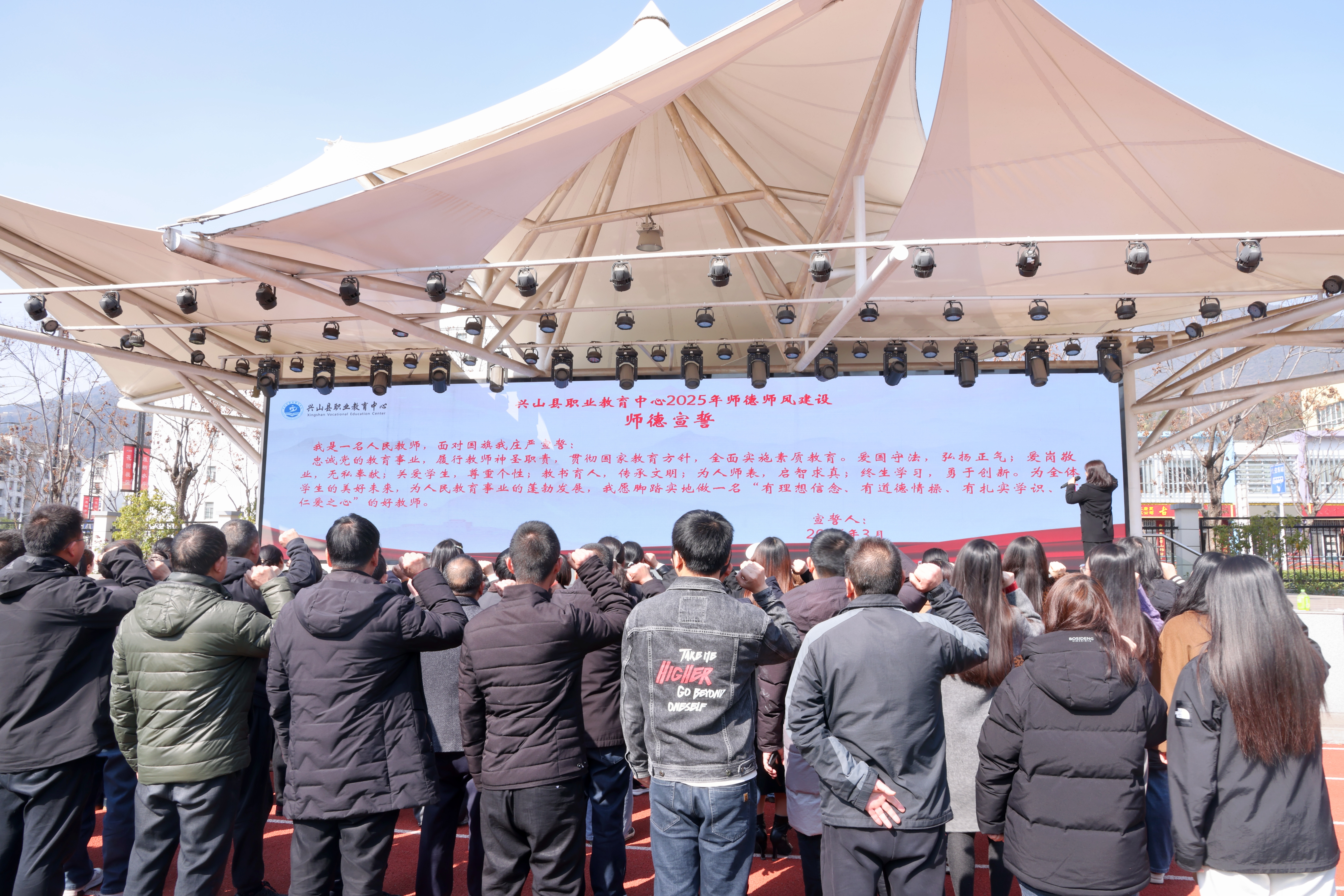 大会在庄严的国歌声中拉开帷幕。全体教职工高举右手,庄严宣誓:“忠诚党的教育事业,履行教师神圣职责,贯彻国家教育方针,全面实施素质教育。爱国守法,弘扬正气;爱岗敬业,无私奉献;关爱学生,尊重个性;教书育人,传承文明;为人师表,启智求真;终生学习,勇于创新。为全体学生的美好未来,为人民教育事业的蓬勃发展,我愿脚踏实地地做一名‘有理想信念,有道德情操,有扎实学识,有仁爱之心’的好教师。”铿锵有力的誓言在操场回荡,彰显了全体教师坚守师德底线、践行育人使命的坚定决心。