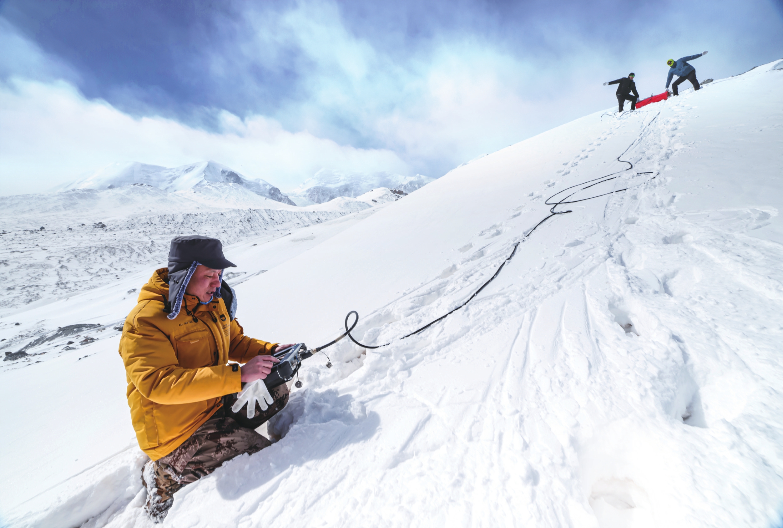 3月19日,青海极地自然资源调查研究院院长张永(左)和同事们操作冰川探地雷达,对阿尼玛卿冰川中的一条复合性冰川进行定期观测。张永从2009年开始组织对该冰川进行常年公益科学观测,他在政协第十四届全国委员会常务委员会第四次会议上发言提出冰山保护建议。