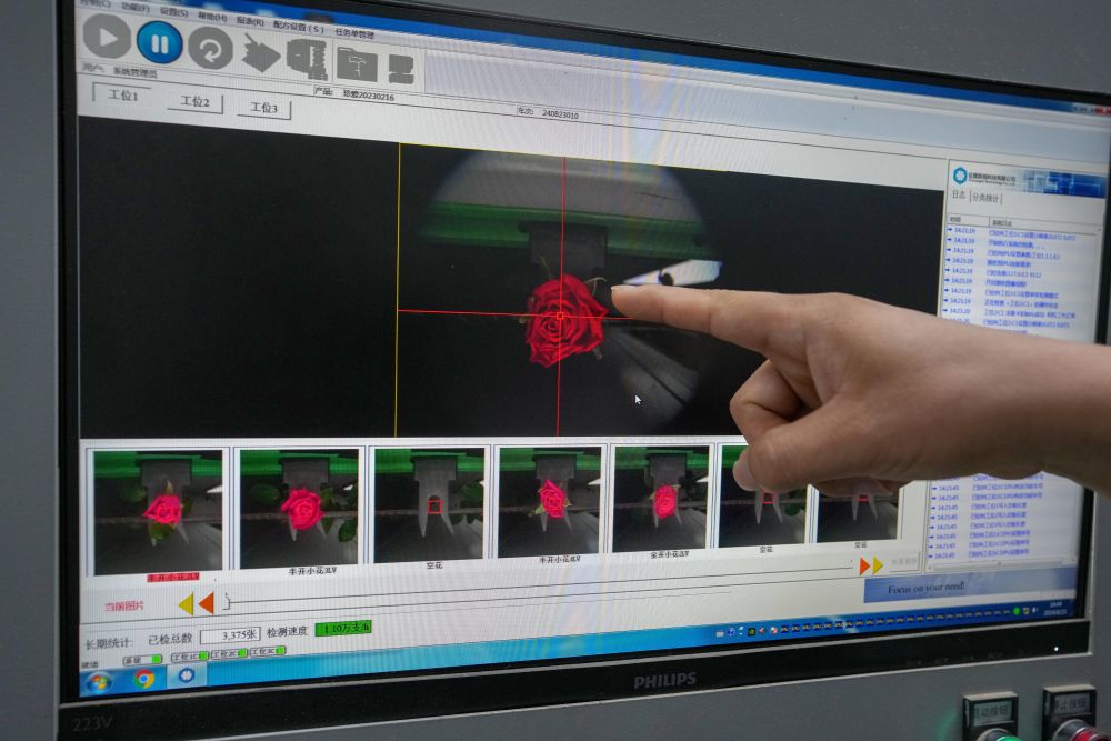 2024年8月23日,在云南晋宁花卉产业现代化示范园采后处理中心,计算机在实时监测自动分拣流水线上的鲜切花。