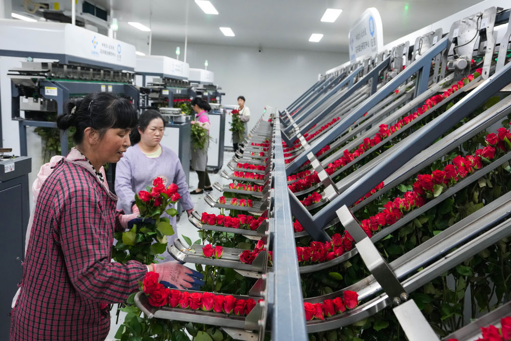 2024年8月23日,在云南晋宁花卉产业现代化示范园采后处理中心,花农将鲜切花自动分拣流水线上分拣好的鲜花取下,准备放入包装流水线。
