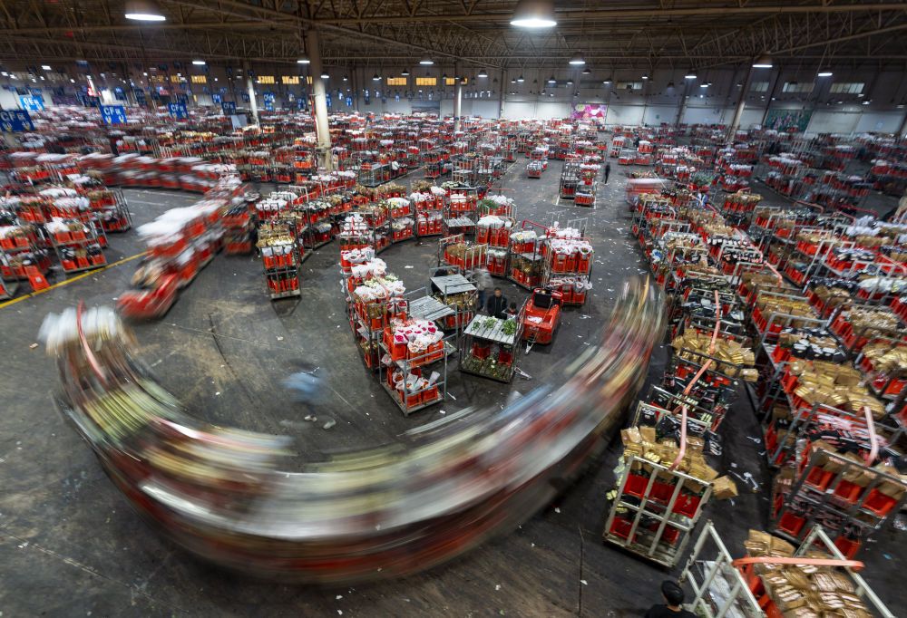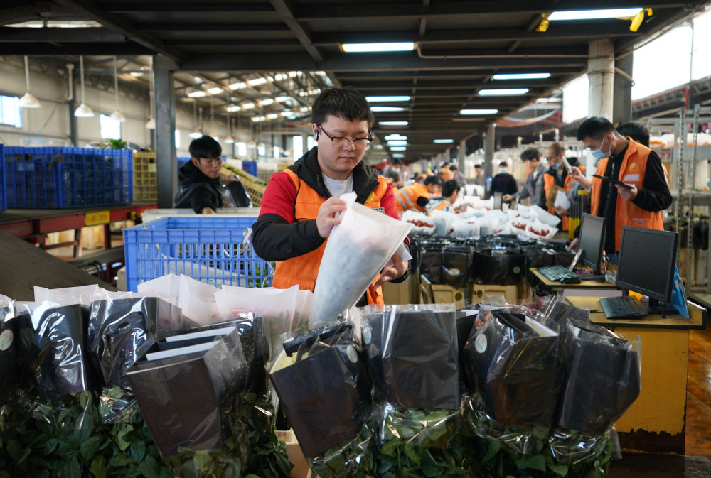 2022年11月11日,工作人员在昆明斗南花市给鲜花贴标签。快递物流时效不断优化、冷链运输技术持续提升,也为中国鲜花加速“出海”保驾护航。