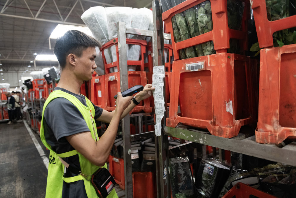 2023年7月13日,一名工作人员在昆明国际花卉拍卖交易中心内对台车上存放的鲜花扫码。