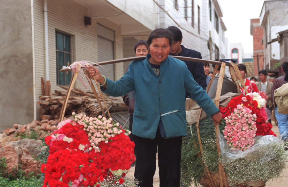 云南省昆明市呈贡龙街乡斗南村是中国有名的“花乡”,全村几乎家家种花。这是一位当地花农挑着一担鲜花去花卉交易市场出售(1999年6月2日发)。