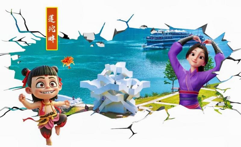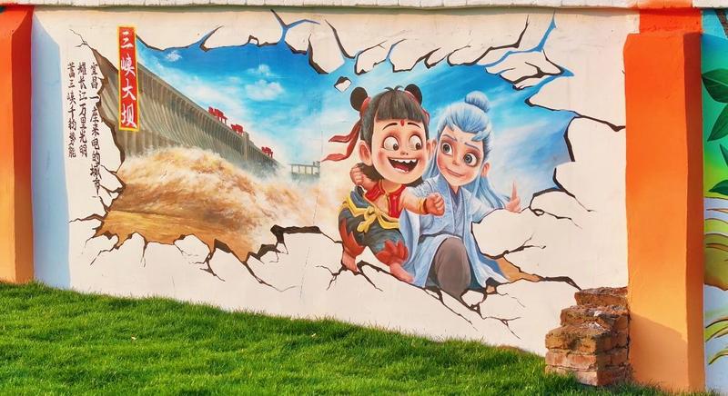 乐天溪文化墙,长68.4米,以“哪吒赶集”为主题,结合当下热点,用“哪吒来当推荐官”的形式,巧妙地推介三峡坝区独有的特产和风景。