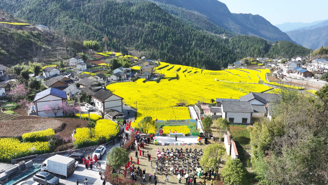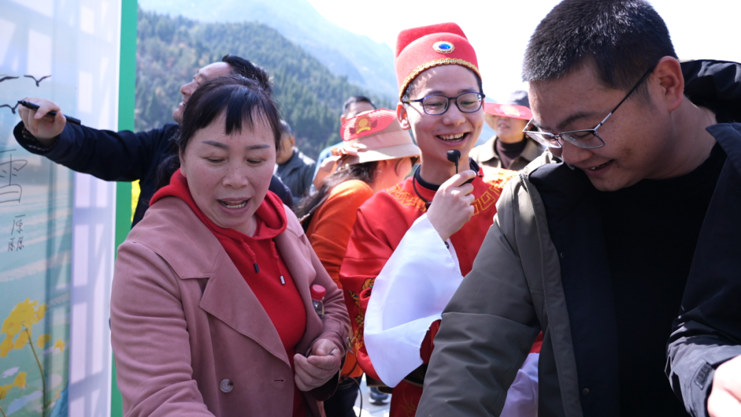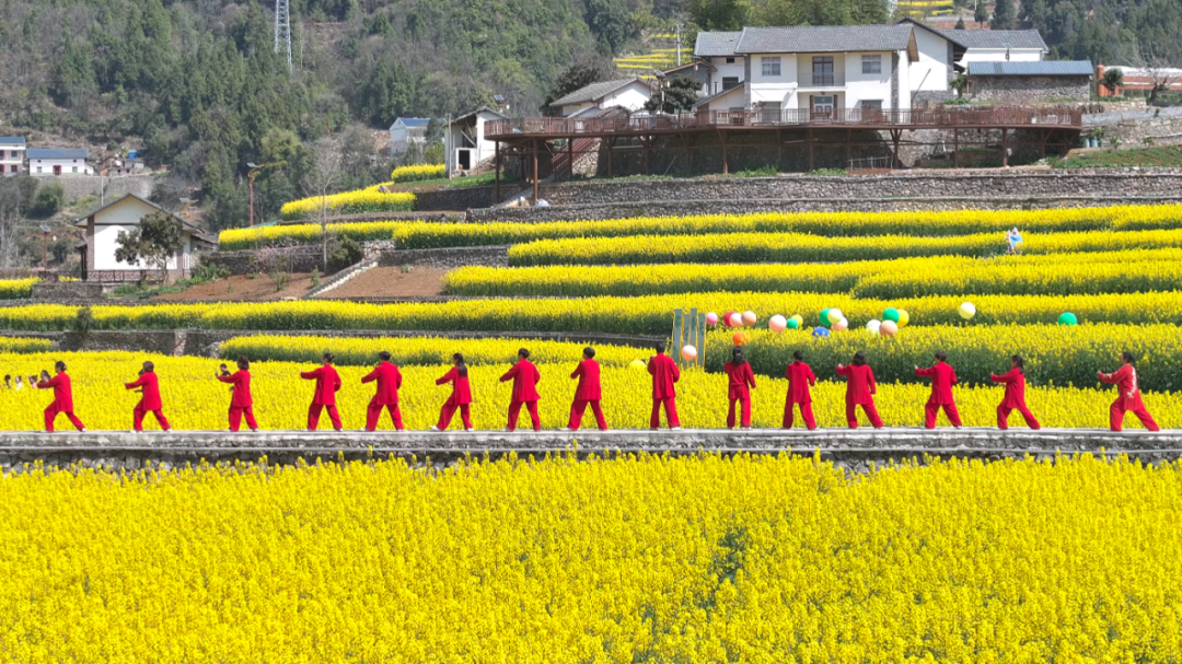 3月21日,湖北省宜昌市兴山县古夫镇龙池村以“龙眼”景观为中心的油菜花田,迎来了一年一度的花海游园会。游客们在这里观花海、赏非遗、品美食,跟随状元装扮的导游,沉浸式体验游园活动,别有一番风味。