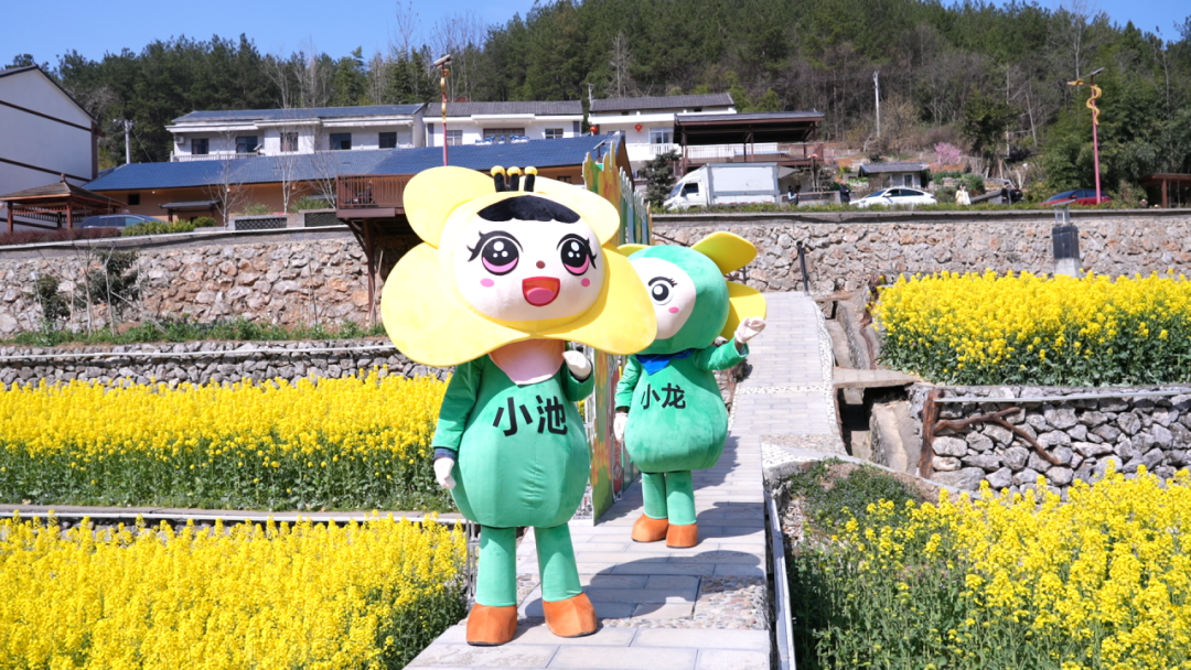 三月的龙池村春意盎然,形似一对龙眼的油菜花田,吸引了四面八方的游客前来观赏。