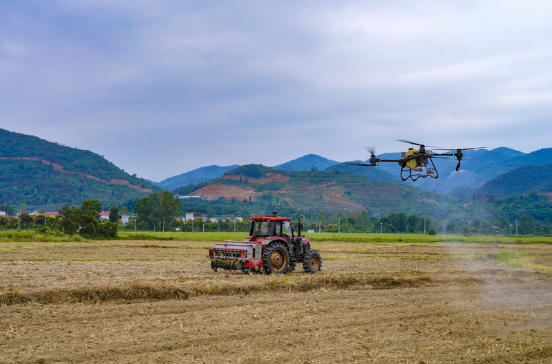 刘仁八镇油菜种植千亩核心示范区,农机与无人机协同作业。