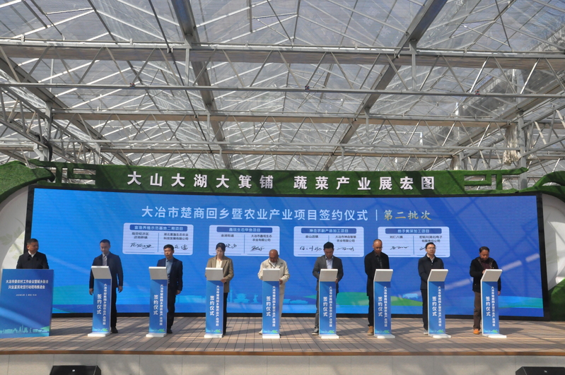 3月20日,大冶市委农村工作会议暨城乡融合兴业富民攻坚行动推进会召开,首次将推进会开进田间地头,将签约会场放在蔬菜大棚。当天,10个总投资21.5亿元的重点农业项目签约落户,一批含新、含绿、含金的项目,正成为撬动大冶城乡融合发展的“金钥匙”。
