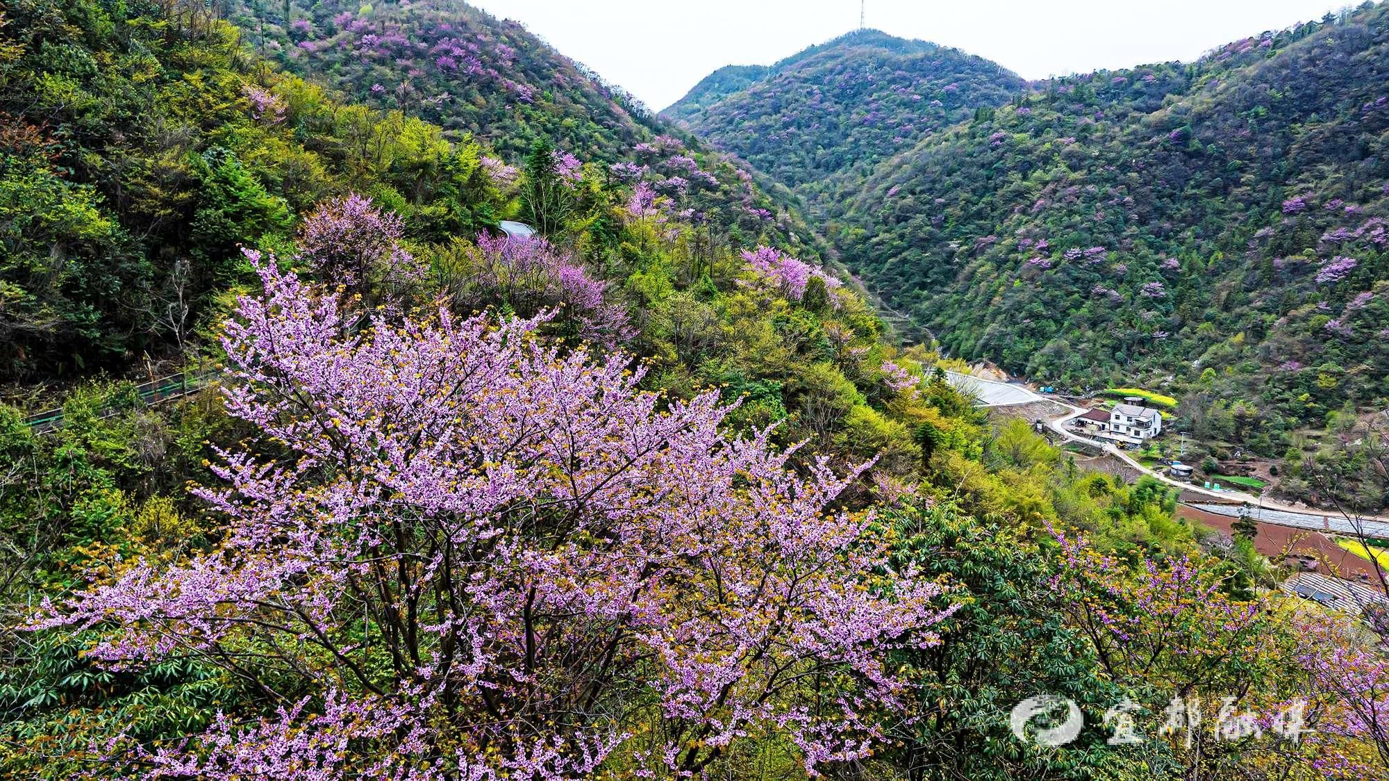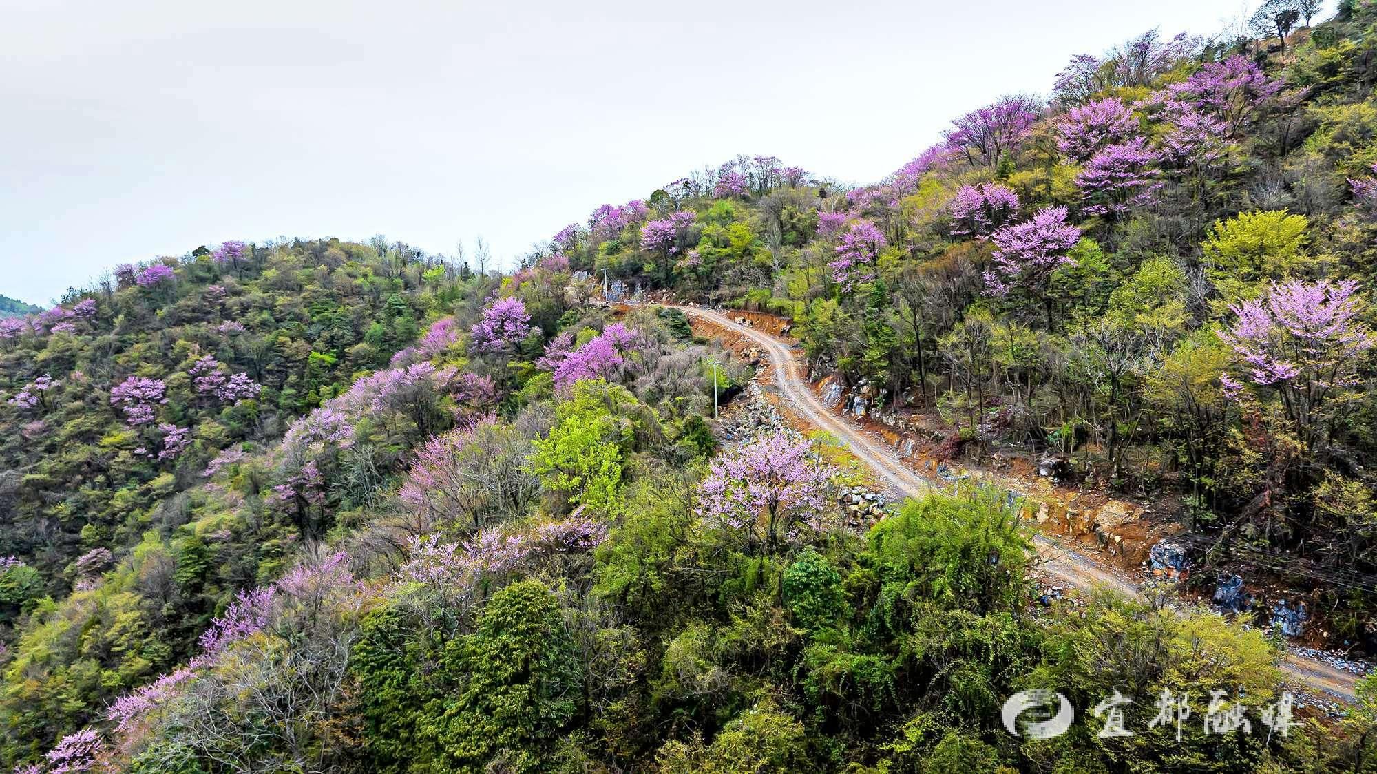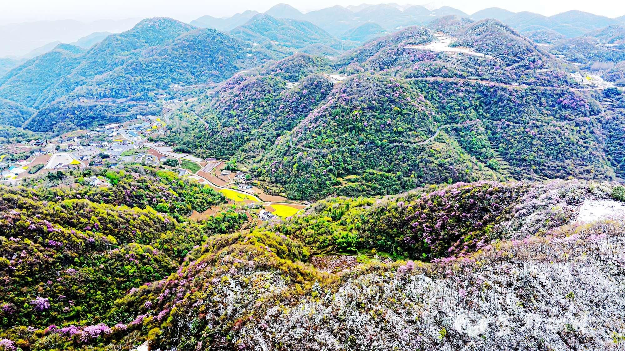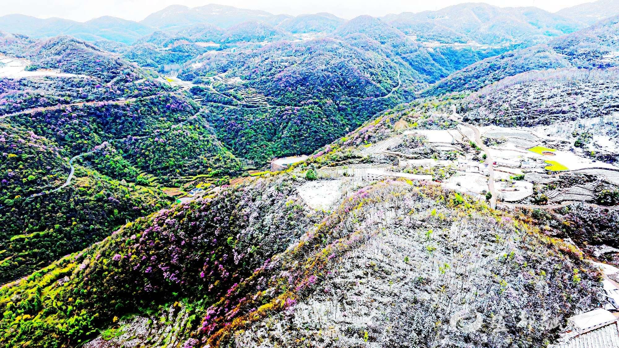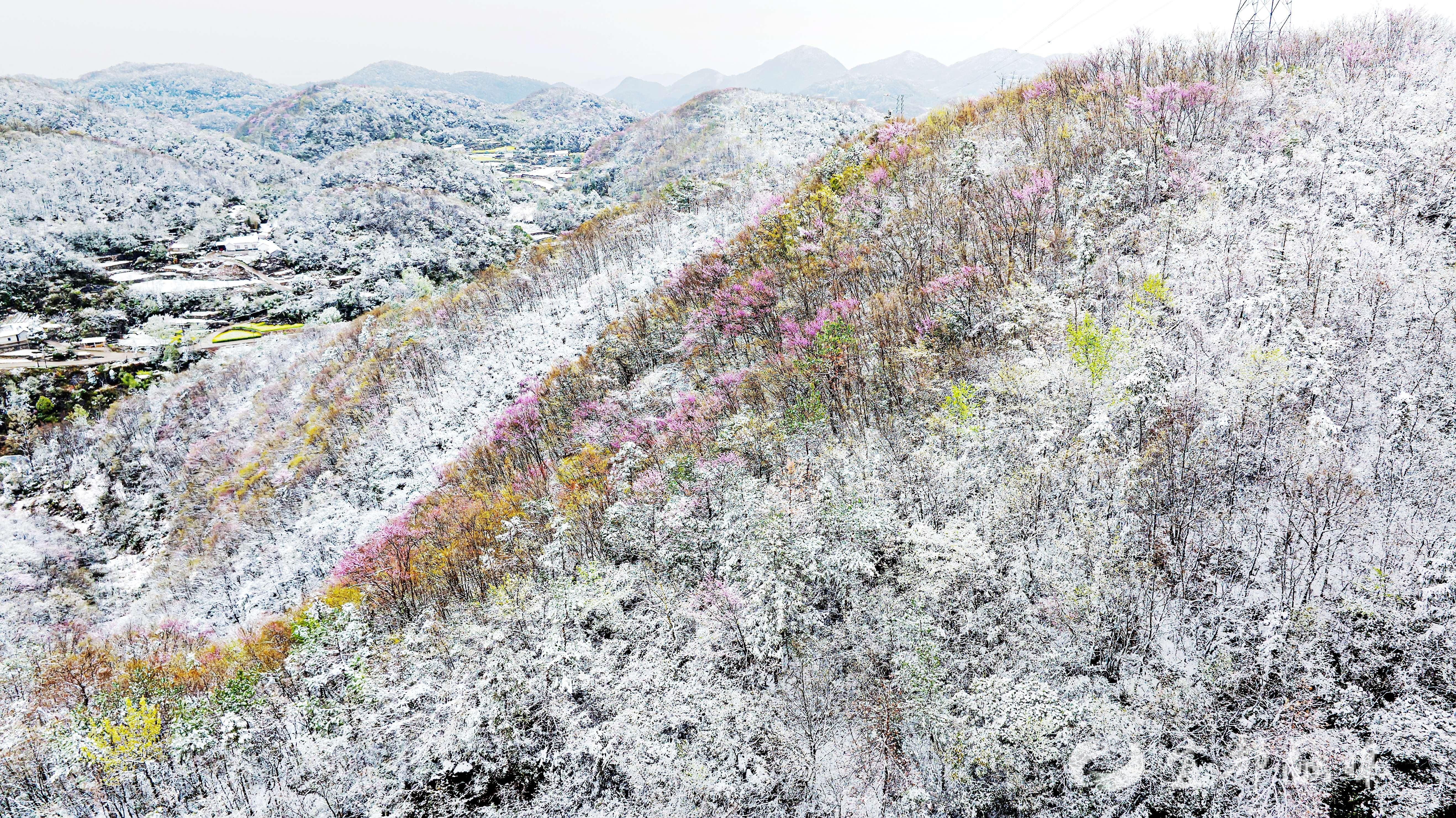 3月29日,受强冷空气影响,湖北宜都气温骤降,部分高海拔山区迎来降雪。在宜都市潘家湾土家族乡梁山村,一场春雪与盛放的野生紫荆花不期而遇,形成了“雪压花枝花映雪”的奇景。