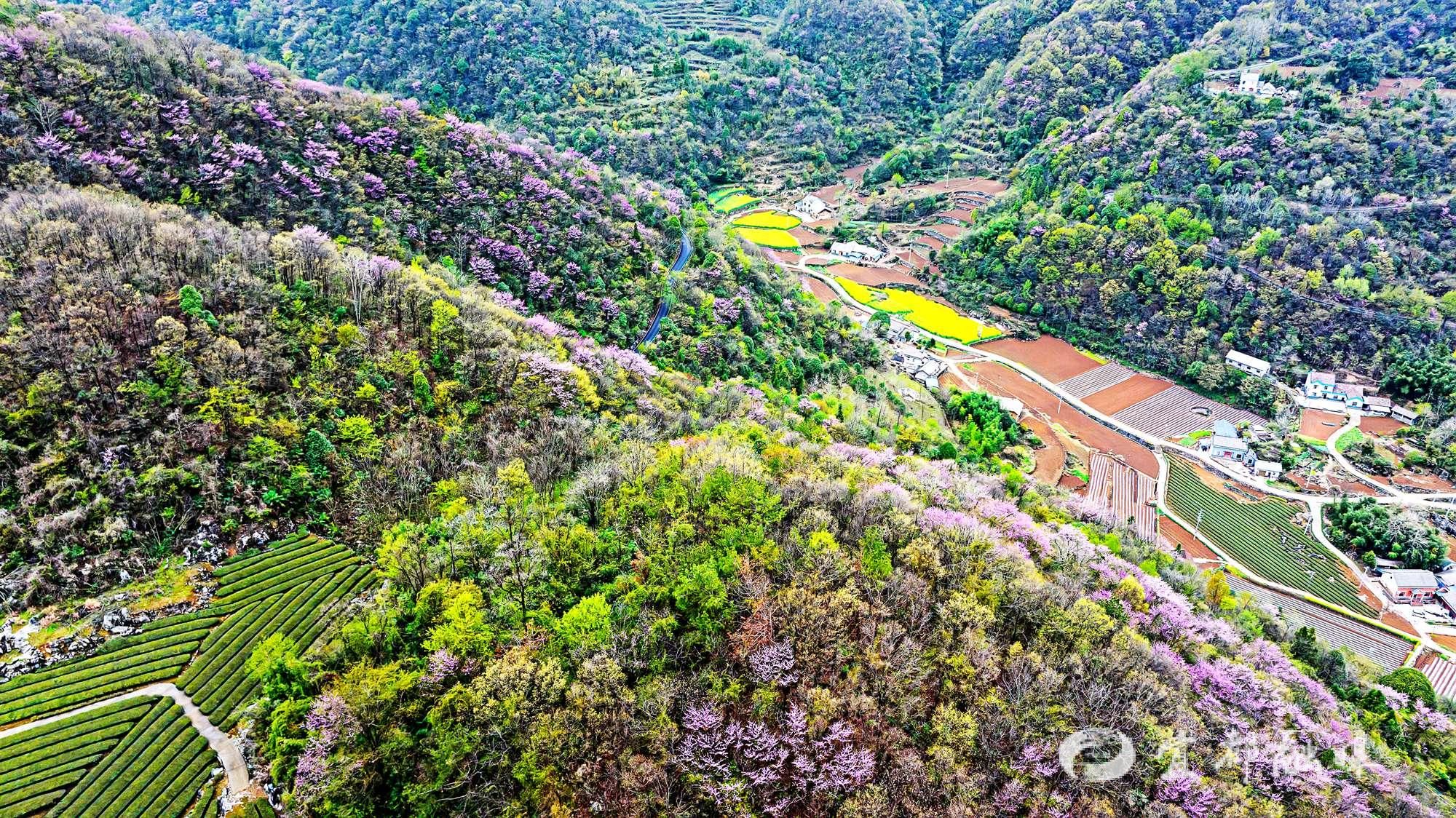 白雪覆盖的山野间,紫荆迎寒怒放,紫红色的花瓣在雪花的映衬下,愈发明艳动人。漫山遍野的紫荆花一丛连着一丛,像天边的绮丽云霞落入山间 ,将整个梁山村温柔环抱。银白的雪与明艳的花相互交织,让这个原本质朴的小山,瞬间变得格外美丽妖娆,宛如童话世界。